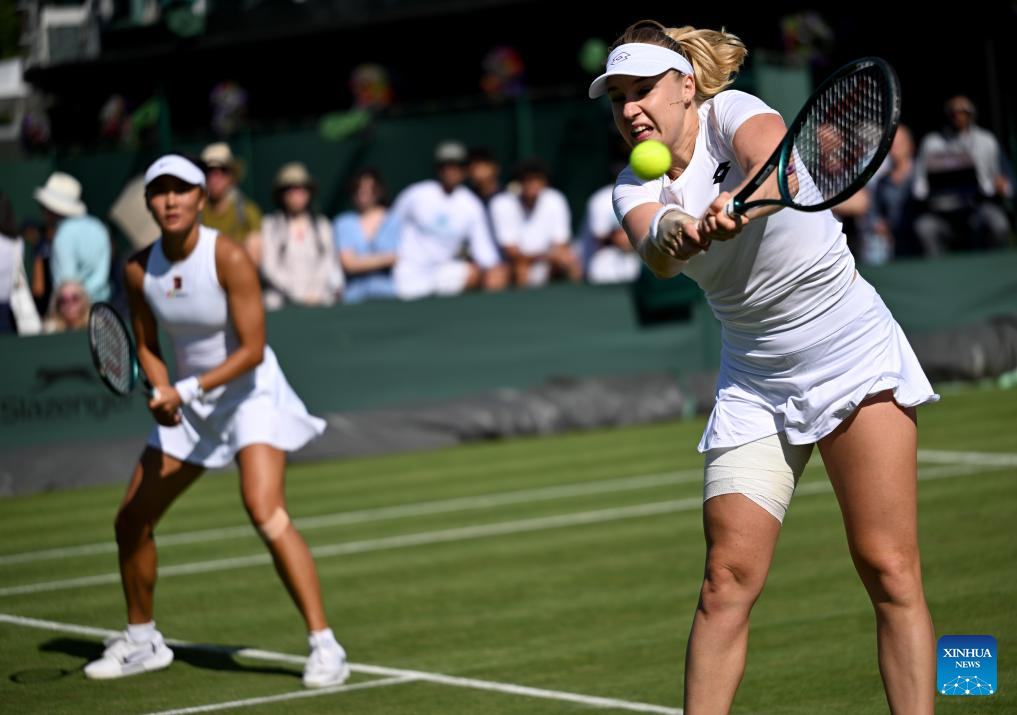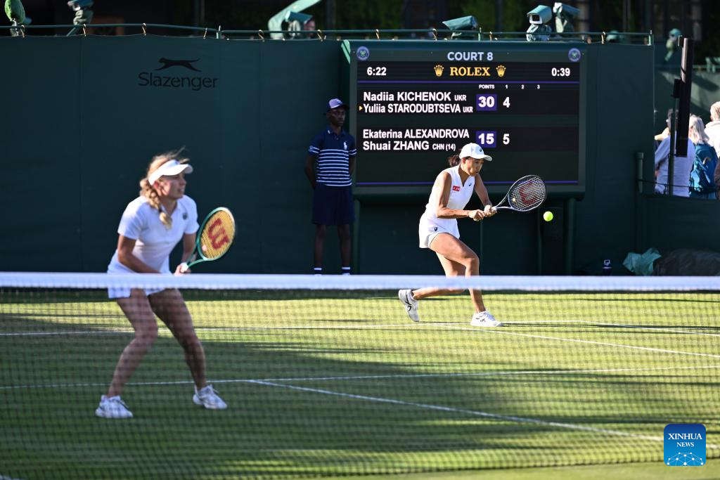Zhang Shuai (R)/Ekaterina Alexandrova compete during the women's doubles first round match between Zhang Shuai (China)/Ekaterina Alexandrova (Russia) and Yuliia Starodubtseva/Nadiia Kichenok of Ukraine at the Wimbledon Tennis Championships in London, Britain, July 2, 2025. (Xinhua/Zhao Dingzhe)