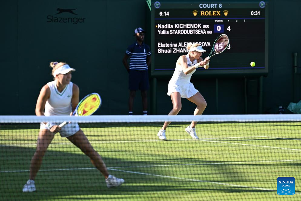 Yuliia Starodubtseva/Nadiia Kichenok (R) compete during the women's doubles first round match between Zhang Shuai (China)/Ekaterina Alexandrova (Russia) and Yuliia Starodubtseva/Nadiia Kichenok of Ukraine at the Wimbledon Tennis Championships in London, Britain, July 2, 2025. (Xinhua/Zhao Dingzhe)