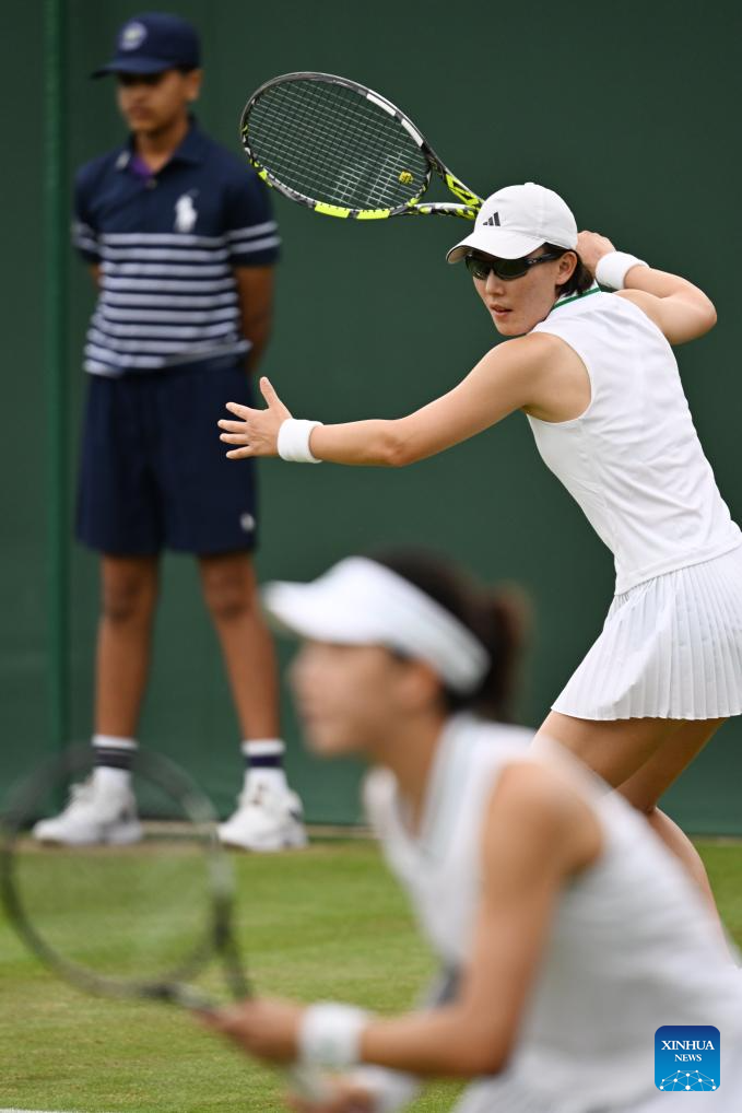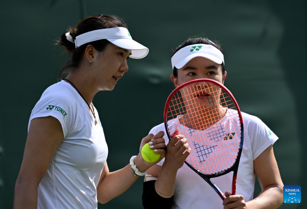 Zhu Lin (L)/Tang Qianhui compete during the women's doubles first round match between Jiang Xinyu (China)/Wu Fang-Hsien (Chinese Taipei) and Zhu Lin/Tang Qianhui of China at the Wimbledon Tennis Championships in London, Britain, July 2, 2025. (Xinhua/Li Ying)