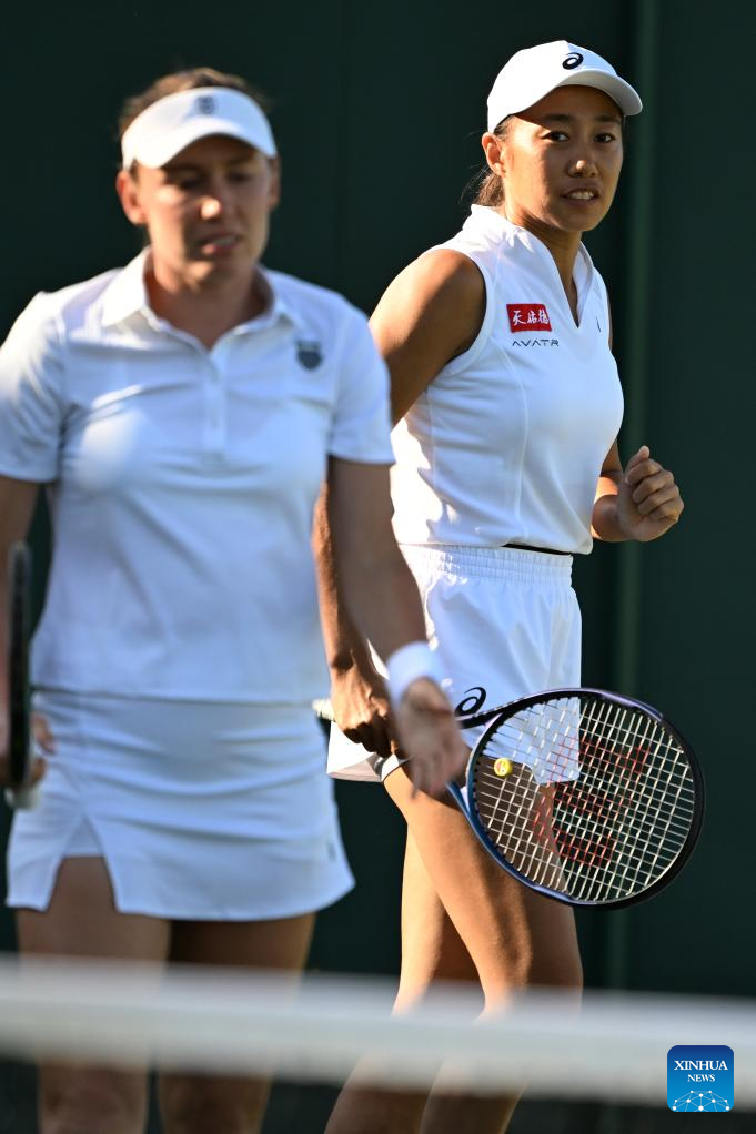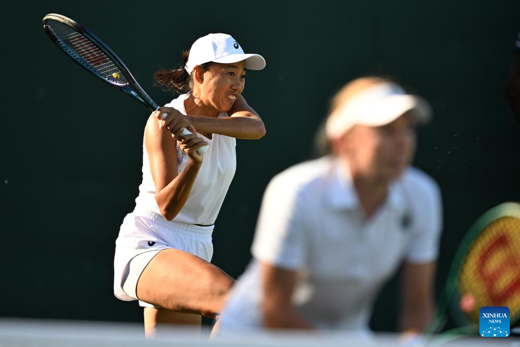 Zhang Shuai (front)/Ekaterina Alexandrova compete during the women's doubles first round match between Zhang Shuai (China)/Ekaterina Alexandrova (Russia) and Yuliia Starodubtseva/Nadiia Kichenok of Ukraine at the Wimbledon Tennis Championships in London, Britain, July 2, 2025. (Xinhua/Zhao Dingzhe)