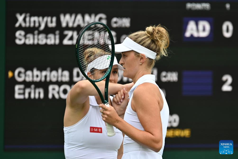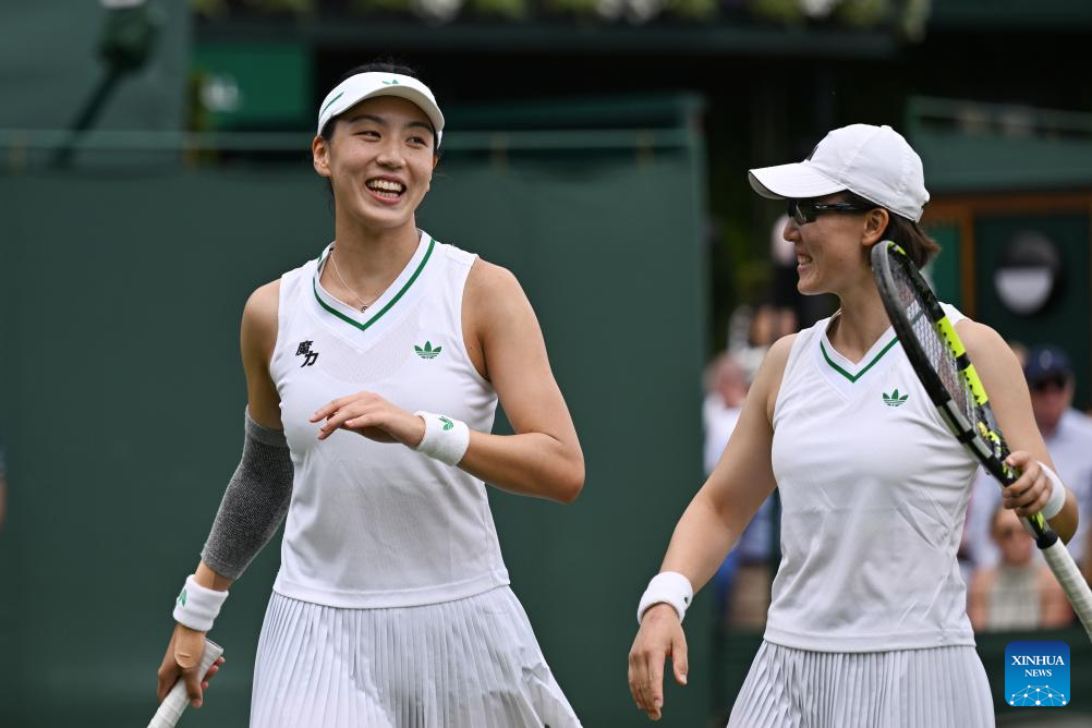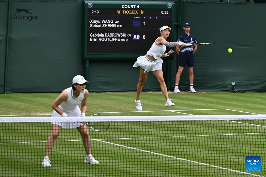 Wang Xinyu (C)/Zheng Saisai compete during the women's doubles first round match between Wang Xinyu/Zheng Saisai of China and Gabriela Dabrowski (Canada)/Erin Routliffe (New Zealand) at the Wimbledon Tennis Championships in London, Britain, July 2, 2025. (Xinhua/Zhao Dingzhe)