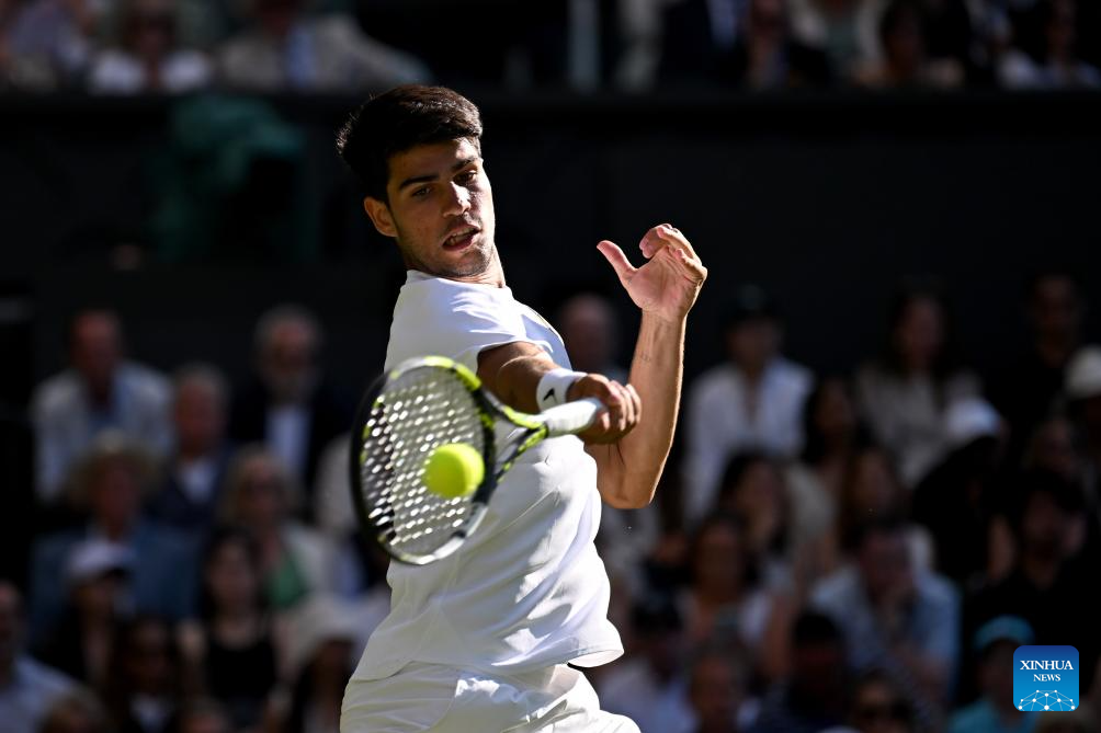 Carlos Alcaraz hits a return during the men's singles second round match between Carlos Alcaraz of Spain and Oliver Tarvet of Britain at the Wimbledon Tennis Championships in London, Britain, July 2, 2025. (Xinhua/Li Ying)