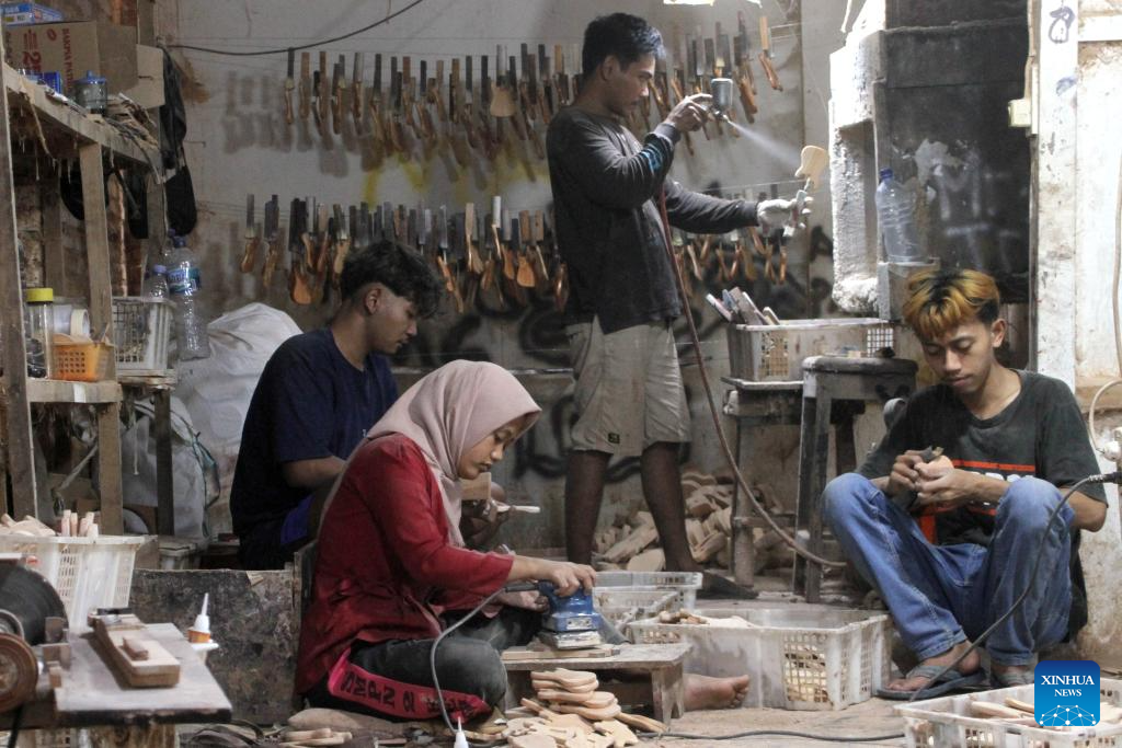 Parts of miniature guitars are seen at a handicraft workshop in Klaten Regency, Central Java, Indonesia, on July 3, 2025. Those miniature guitars are made from mahogany, aluminum, fiber, resin and strings. (Photo by Bram Selo/Xinhua)