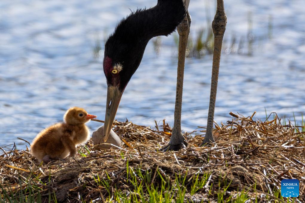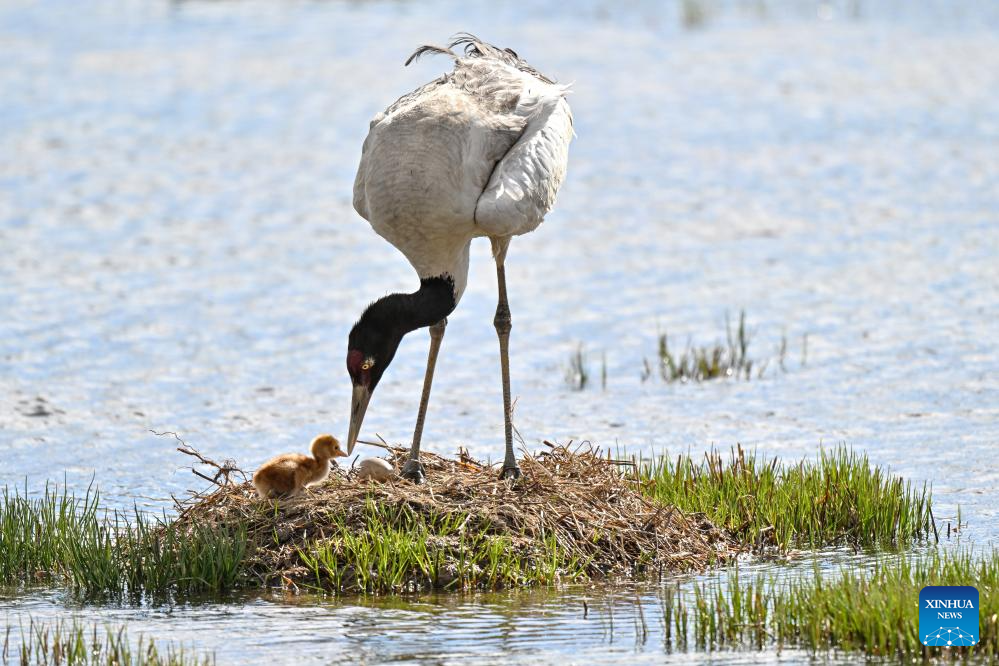 A black-necked crane takes care of its baby at a wetland in Xainza County of Nagqu City, southwest China's Xizang Autonomous Region, June 5, 2025. As an important part of the world's ecosystem, wetland plays a huge role in many aspects including ecology, environment, economy and society. (Xinhua/Tenzing Nima Qadhup)