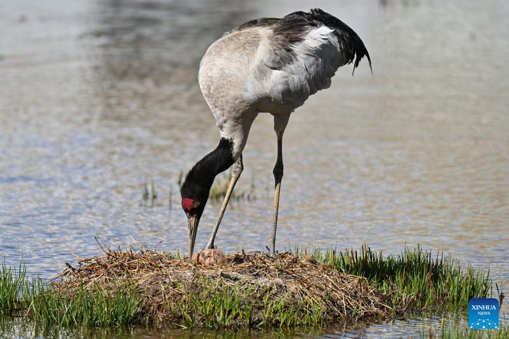 A black-necked crane checks its baby at a wetland in Xainza County of Nagqu City, southwest China's Xizang Autonomous Region, June 4, 2025. As an important part of the world's ecosystem, wetland plays a huge role in many aspects including ecology, environment, economy and society.(Xinhua/Sun Ruibo)