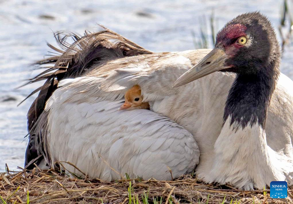 A black-necked crane keeps its baby warm under its body while the other remains vigilant at a wetland in Xainza County of Nagqu City, southwest China's Xizang Autonomous Region, June 4, 2025. As an important part of the world's ecosystem, wetland plays a huge role in many aspects including ecology, environment, economy and society. (Xinhua/Jiang Fan)