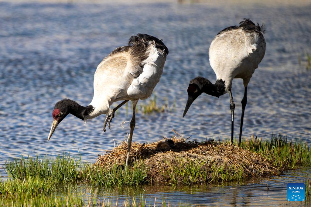Black-necked cranes take turns to take care of their baby at a wetland in Xainza County of Nagqu City, southwest China's Xizang Autonomous Region, June 4, 2025. As an important part of the world's ecosystem, wetland plays a huge role in many aspects including ecology, environment, economy and society. (Xinhua/Jiang Fan)