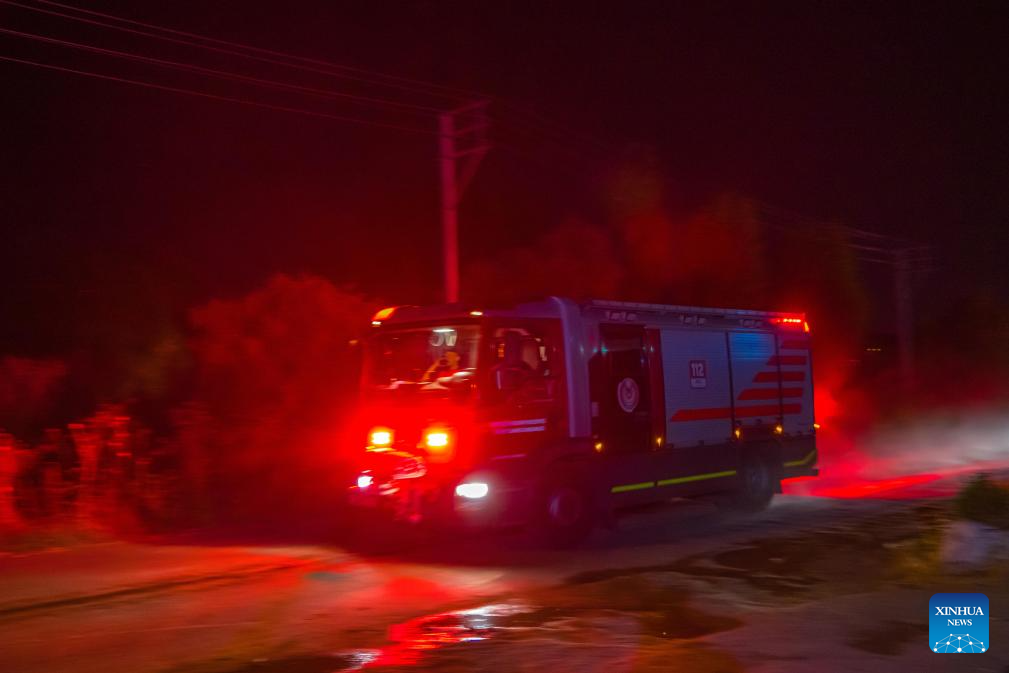 A fire truck is seen near a wildfire in the Odemis district of Izmir, Türkiye. Izmir Governor Suleyman Elban said on Thursday that the wildfire erupted on Wednesday afternoon in the Cesme district, a popular coastal tourist destination. The blaze has been taken under control, but the inland district of Odemis remains uncontrolled, he added. According to Elban, the fires were caused by faults in electricity distribution lines and there are no signs of sabotage. (Mustafa Kaya/Handout via Xinhua)
