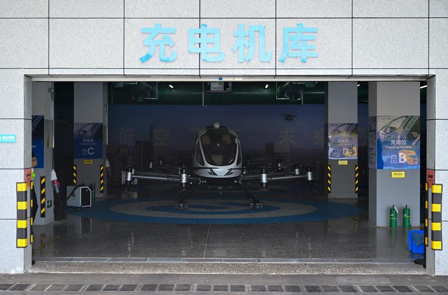 A drone photo taken on July 2, 2025 shows an electric vertical take-off-and-landing (eVTOL) aircraft performing flight demonstration at Luogang Park in Hefei, east China's Anhui Province. (Xinhua/Zhou Mu)