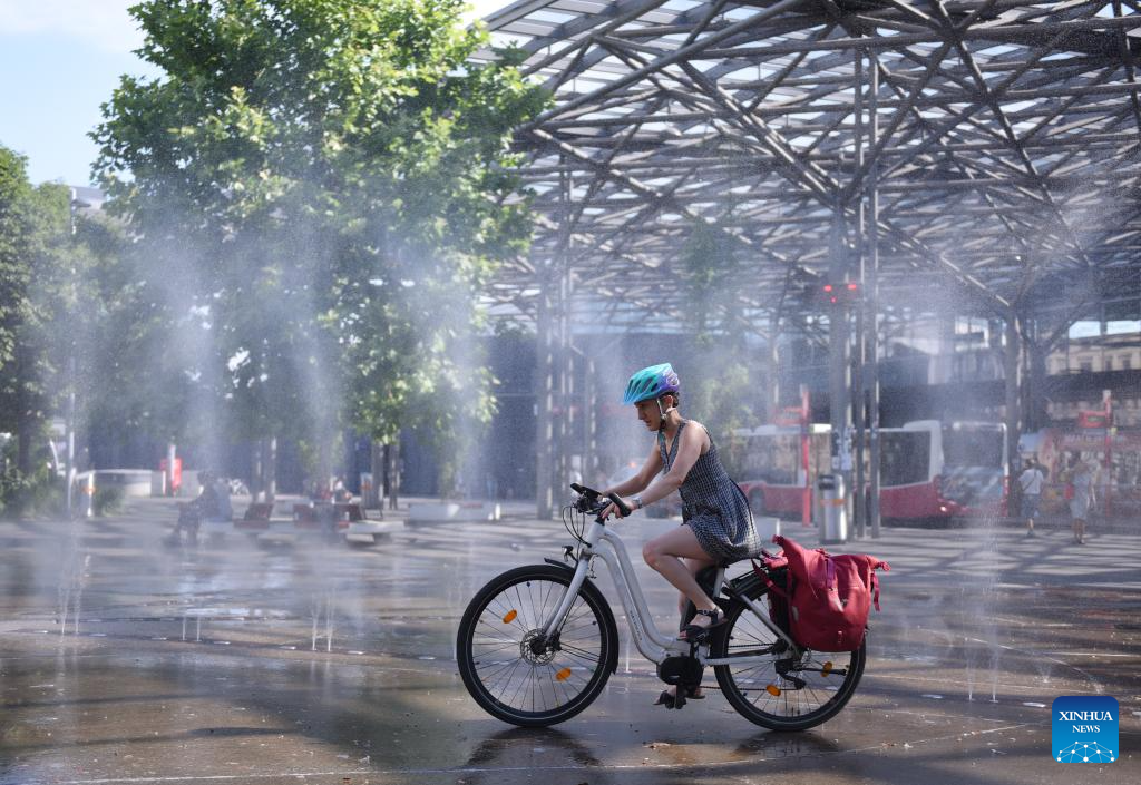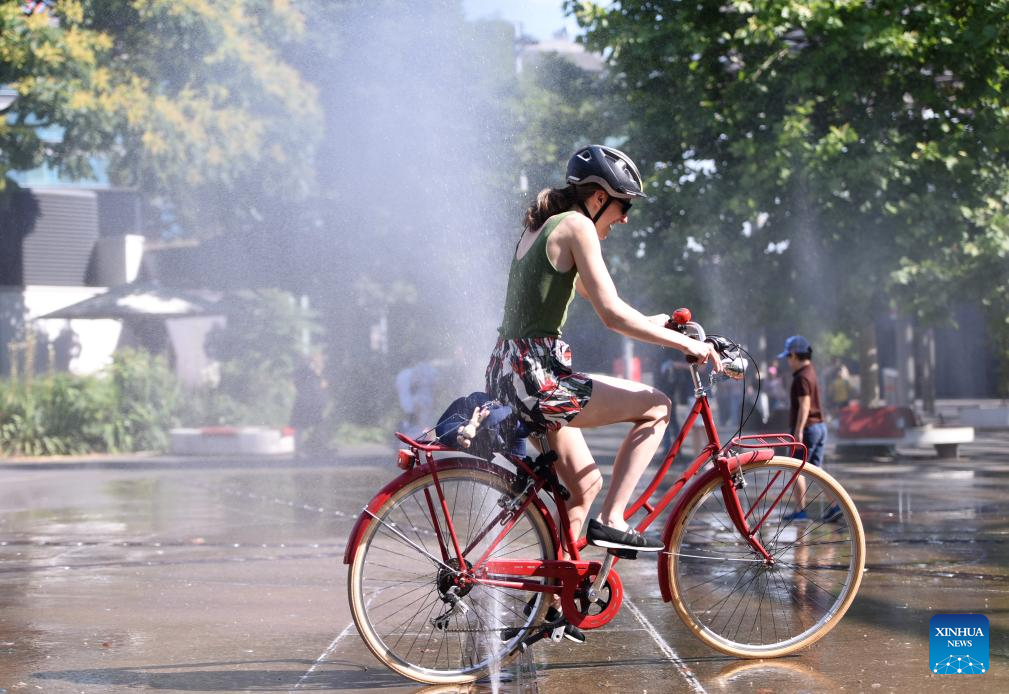 A woman rides past a splash pad during a heatwave in Vienna, Austria, July 3, 2025. (Xinhua/He Canling)