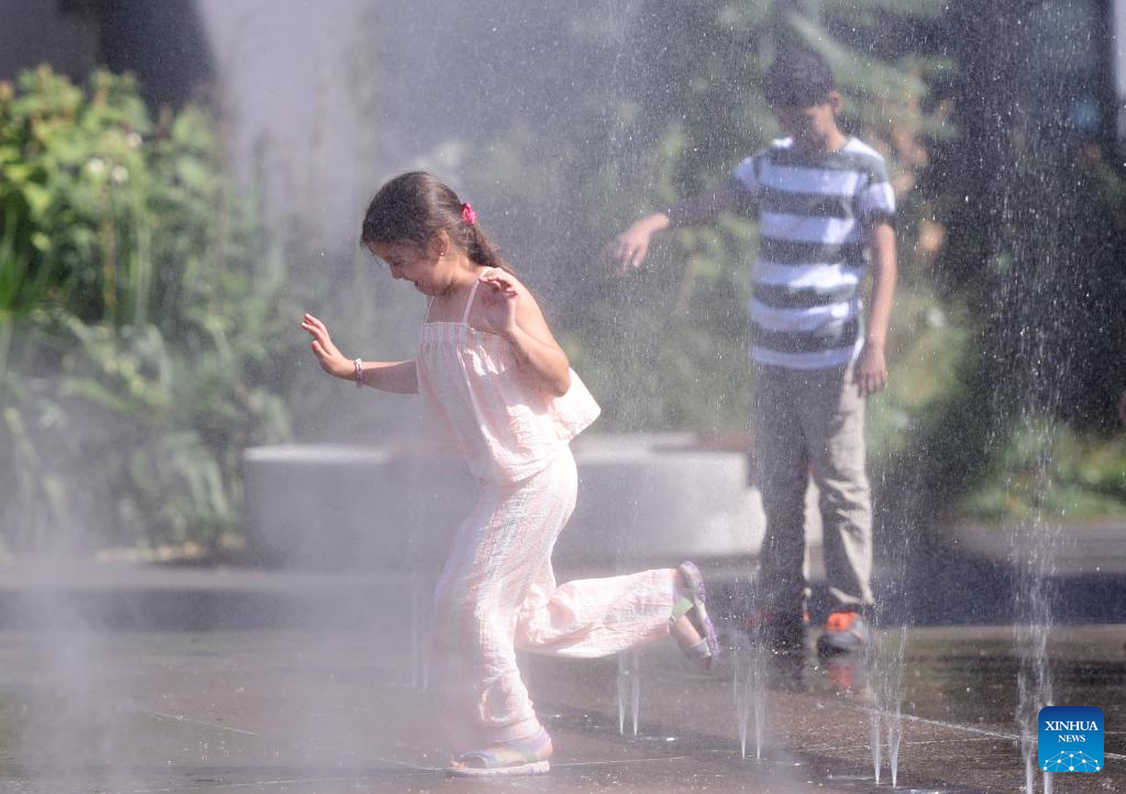 Children cool off at a splash pad during a heatwave in Vienna, Austria, July 3, 2025. (Xinhua/He Canling)
