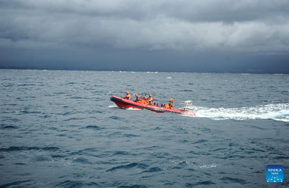 Rescuers in operation are pictured aboard a boat in waters near East Java, Indonesia, July 4, 2025. Six people were confirmed dead, 24 remain missing and 35 others have survived after a passenger ship sank in Indonesia's Bali Strait on Wednesday night, according to Gusti Ayu Ketut Wijayanti, spokesperson for the Search and Rescue Office in Bali. The ship carried 53 passengers, 12 crew members, and a dozen vehicles. (National Search and Rescue Agency of Indonesia/Handout via Xinhua)