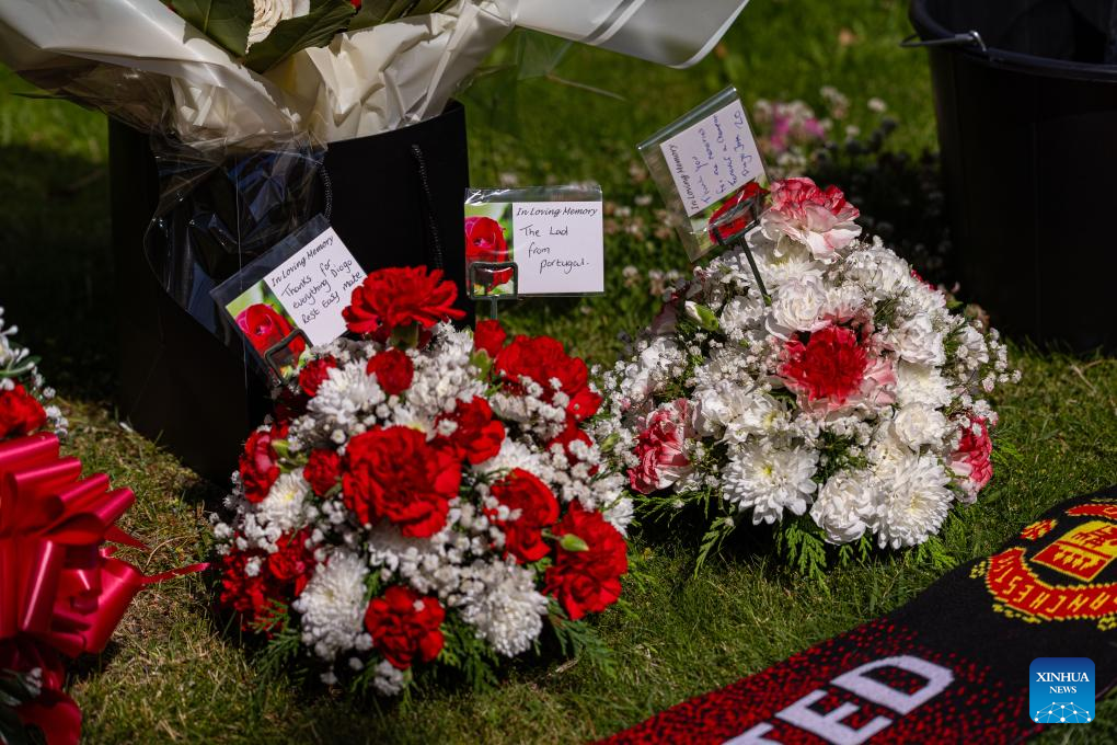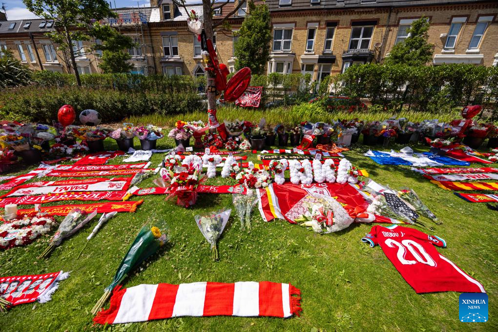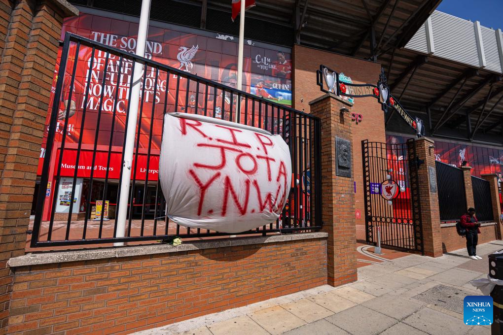 Flowers and tributes to Diogo Jota are left outside Anfield Stadium in Liverpool, Britain, July 3, 2025. Liverpool's Portuguese international forward Diogo Jota and his brother Andre died in the early hours of Thursday morning in a car accident in north-east Spain, according to Spanish authorities. (Xinhua)