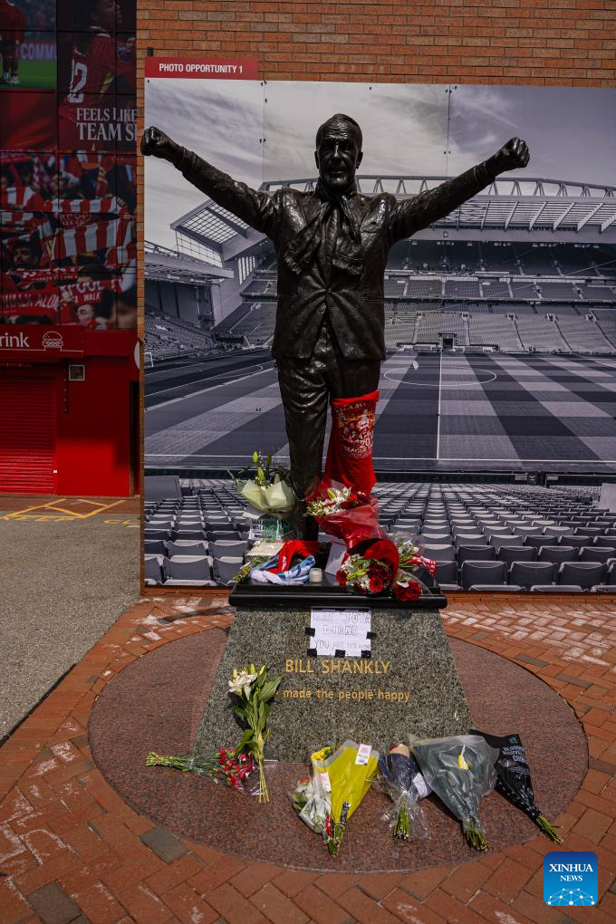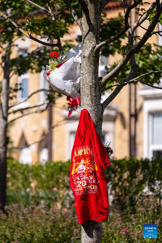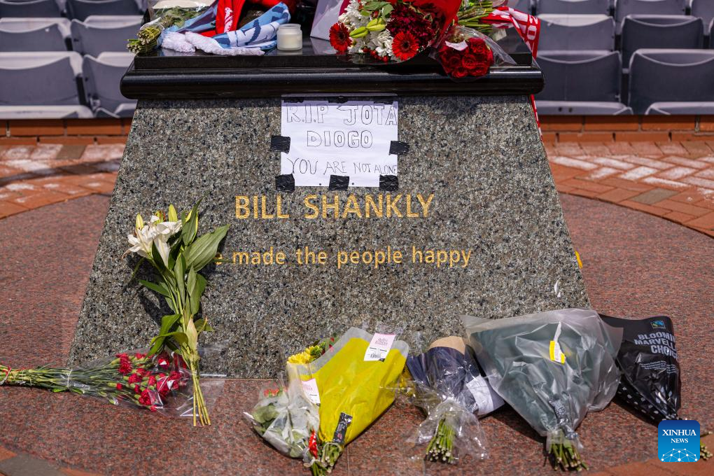Flowers and tributes to Diogo Jota are left under a statue of former Liverpool manager Bill Shankly outside Anfield Stadium in Liverpool, Britain, July 3, 2025. Liverpool's Portuguese international forward Diogo Jota and his brother Andre died in the early hours of Thursday morning in a car accident in north-east Spain, according to Spanish authorities. (Xinhua)