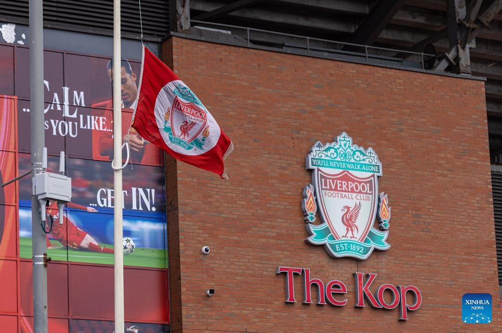Liverpool FC flag flies at half-mast outside Anfield Stadium in Liverpool, Britain, July 3, 2025. Liverpool's Portuguese international forward Diogo Jota and his brother Andre died in the early hours of Thursday morning in a car accident in north-east Spain, according to Spanish authorities. (Xinhua)