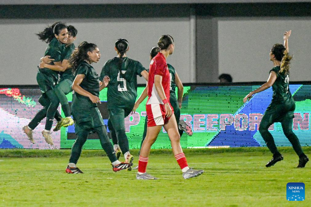 Players of Pakistan celebrate after scoring during the AFC Women's Asian Cup 2026 Qualifiers Group D football match between Indonesia and Pakistan in Tangerang, Indonesia, July 2, 2025. (Xinhua/Agung Kuncahya B.)