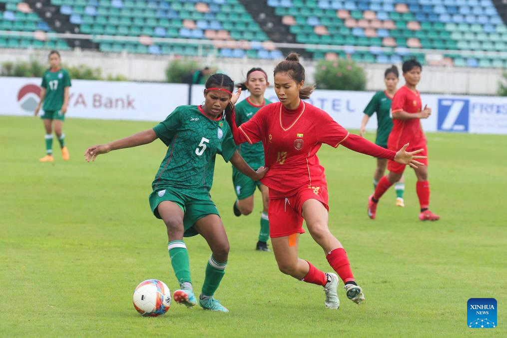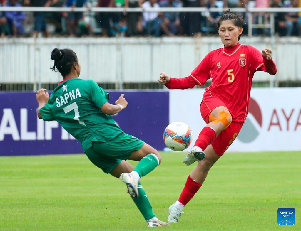 Myat Noe Khin (R) of Myanmar competes during the AFC Women's Asian Cup 2026 Qualifiers Group C football match between Myanmar and Bangladesh in Yangon, Myanmar, July 2, 2025. (Xinhua/Myo Kyaw Soe)