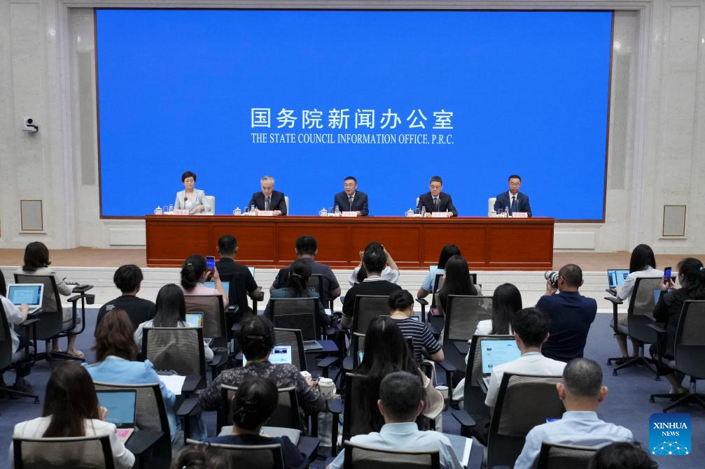 China's State Council Information Office holds a press conference on an array of cultural events marking the 80th anniversary of the victory in the Chinese People's War of Resistance Against Japanese Aggression and the World Anti-Fascist War, in Beijing, capital of China, July 3, 2025. Vice Minister of Culture and Tourism Lu Yingchuan, Vice Minister of the National Radio and Television Administration Liu Jianguo, Vice President of the China Media Group Wang Xiaozhen, and President of the Museum of the War of Chinese People's Resistance Against Japanese Aggression Luo Cunkang briefed the media on a themed exhibition, the release of outstanding literary and artistic works, and other related events, and took questions from reporters. (Xinhua/Cai Yang)