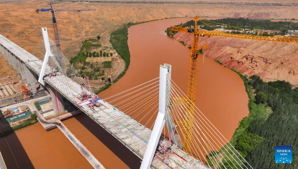 An aerial drone photo taken on July 3, 2025 shows the Heishan Gorge Yellow River grand bridge in Zhongwei City, northwest China's Ningxia Hui Autonomous Region. The two sides of the Heishan Gorge Yellow River grand bridge were joined together on Thursday, laying a solid foundation for the bridge's completion within this year.