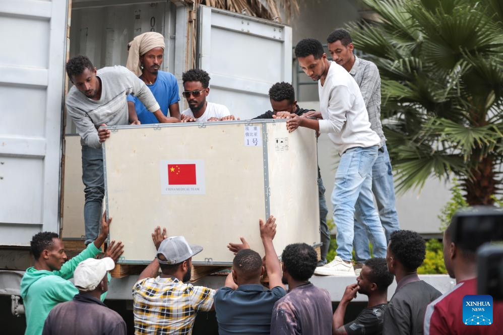 People unload medical supplies from a truck at the Tirunesh-Beijing Hospital, on the outskirts of Addis Ababa, Ethiopia, on July 2, 2025. The 25th batch of the Chinese medical team in Ethiopia has donated much-needed medical supplies to the Tirunesh-Beijing Hospital, also known as the Ethio-China Friendship Hospital, located on the outskirts of Addis Ababa. (Xinhua/Michael Tewelde)