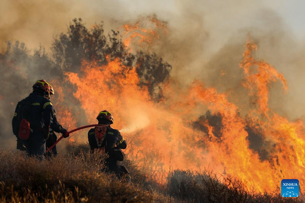 Firefighters battle the flames that keep burning forests and farmland near Ierapetra on the island of Crete, Greece, on July 3, 2025. Two major wildfires, one on the island of Crete and another near the port town of Rafina east of Athens, have forced the evacuation of more than 5,000 residents and tourists, Greek authorities said on Thursday. (Photo by Stefanos Repanis/Xinhua)