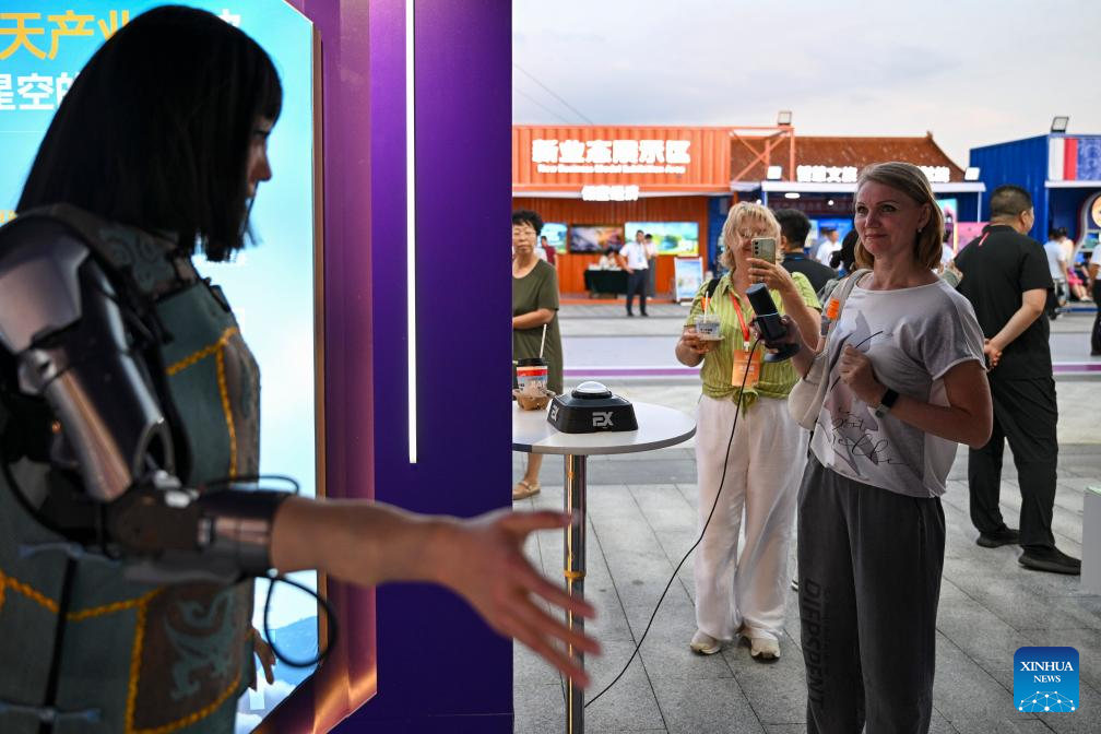 A Russian tourist interacts with a humanoid robot at a market in Dongji (meaning "eastmost of China") Square in Fuyuan City, northeast China's Heilongjiang Province, July 2, 2025. (Xinhua/Zhang Tao)