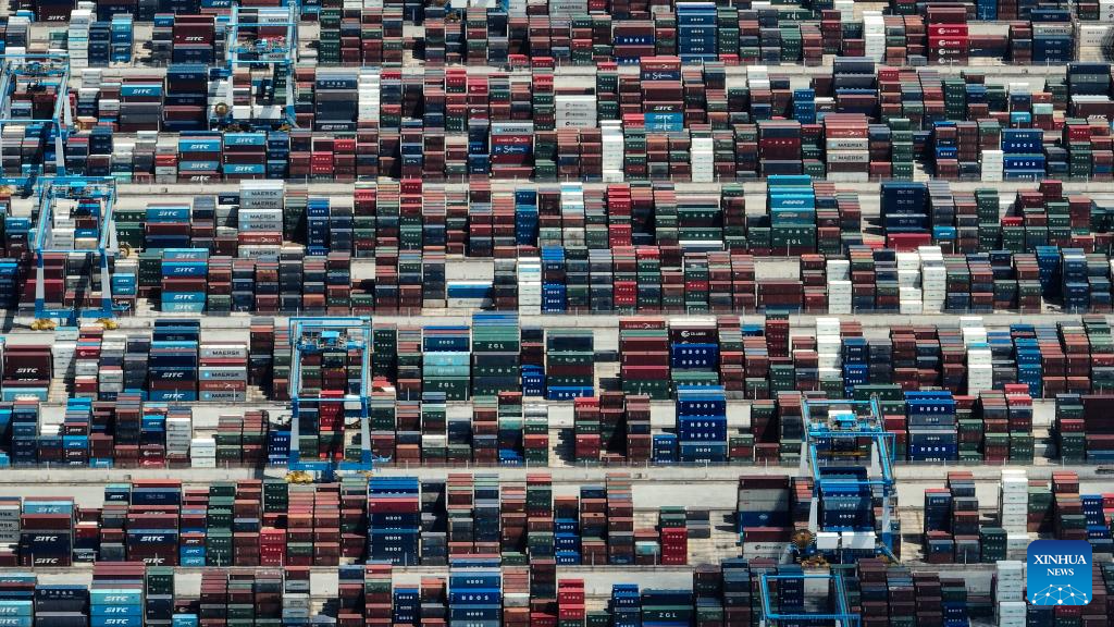 An aerial drone photo taken on July 3, 2025 shows a container yard of an automated container terminal of Qinzhou Port in Qinzhou City, south China's Guangxi Zhuang Autonomous Region. Cargo volume on the New International Land-Sea Trade Corridor surged 76.9 percent year on year to 746,000 twenty-foot equivalent units (TEUs) in the first six months of this year, according to the China Railway Nanning Group.