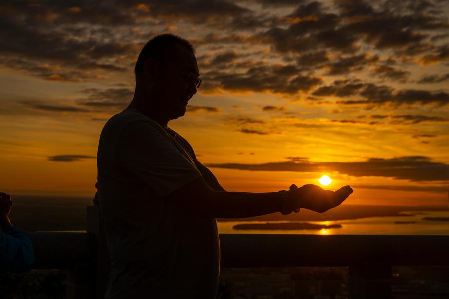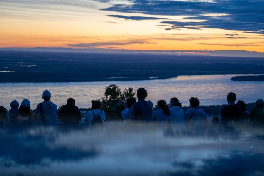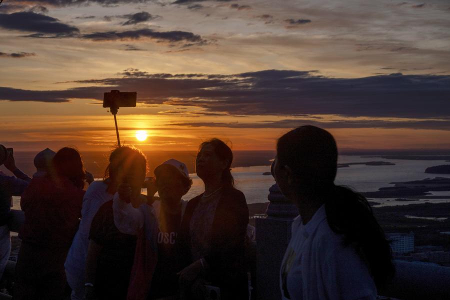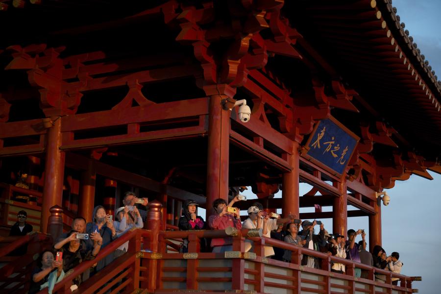 A tourist poses for photos with the rising sun at Dongji Pavilion in Fuyuan City, northeast China's Heilongjiang Province, July 4, 2025. (Xinhua/Zhang Tao)