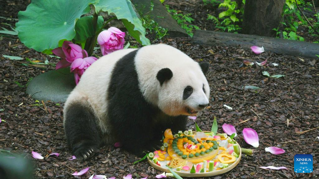 CHENGDU, July 4 (Xinhua) -- In the early hours of Friday morning, fans could be found camping out for their chance to glimpse a celebrity: a 200-pound, onigiri-shaped panda who moves like a "sticky rice dumpling" and specializes in chowing down on bamboo.