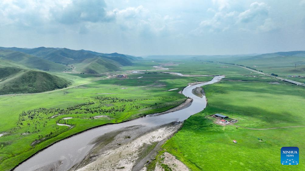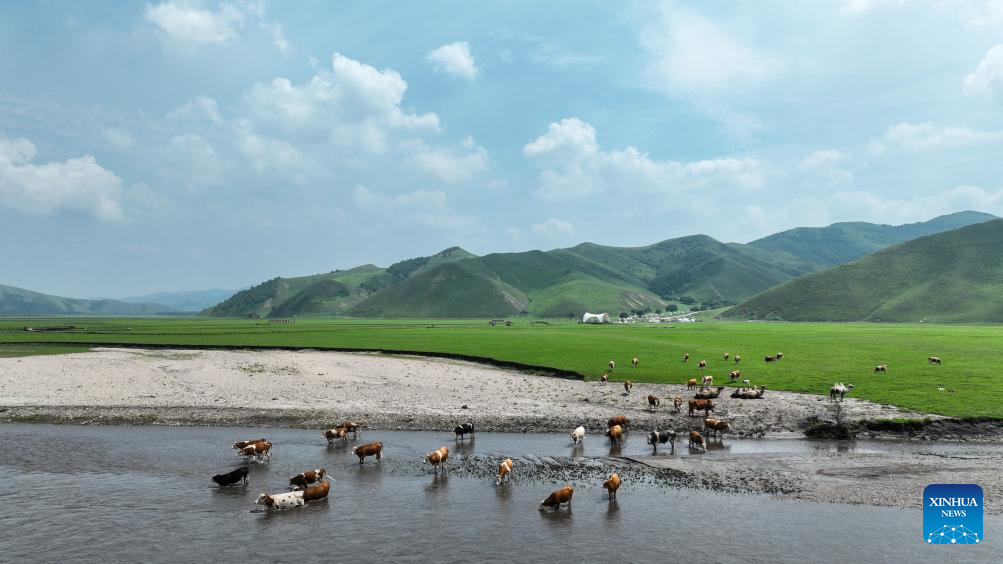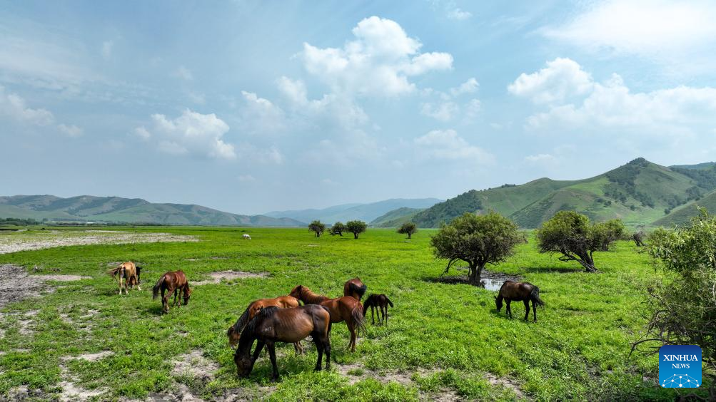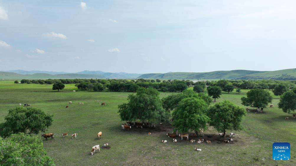 An aerial drone photo taken on July 4, 2025 shows the scenery of the Wulanmaodu pasture in Horqin Right Wing Front Banner, Hinggan League, north China's Inner Mongolia Autonomous Region. In the first half of this year, the banner recorded 2.55 million tourist trips, with total tourism expenditure reaching 882 million yuan (about 123.12 million U.S. dollars). (Xinhua/Bei He)