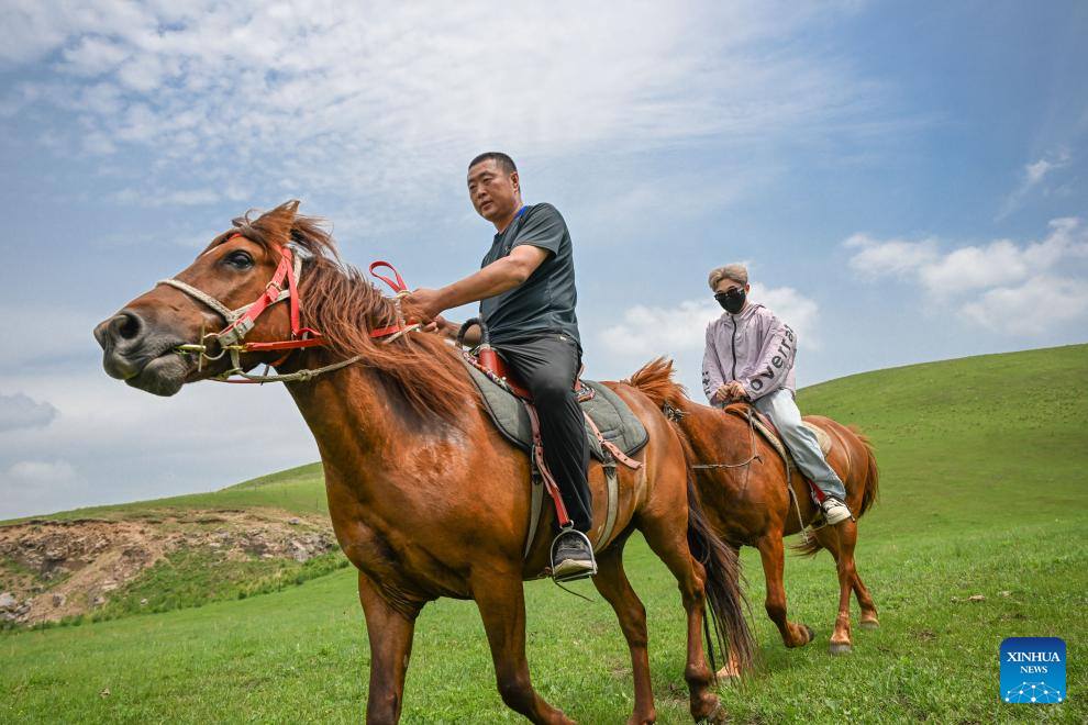 A tourist (back) rides a horse under the guidance of a herdsman at the Wulanmaodu pasture in Horqin Right Wing Front Banner, Hinggan League, north China's Inner Mongolia Autonomous Region, July 4, 2025. In the first half of this year, the banner recorded 2.55 million tourist trips, with total tourism expenditure reaching 882 million yuan (about 123.12 million U.S. dollars). (Xinhua/Bei He)