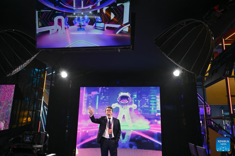 A guest experiences virtual filming technology at the Yongchuan International Convention and Exhibition Center in southwest China's Chongqing, July 4, 2025. The 2025 SCO (the Shanghai Cooperation Organization) Film Festival takes place from July 3 to 7 here, attracting filmmakers from Russia, Belarus, Pakistan and other SCO member states to present their country's films. The event also gathered over 40 domestic film enterprises to present the latest advancements in film technology and production.