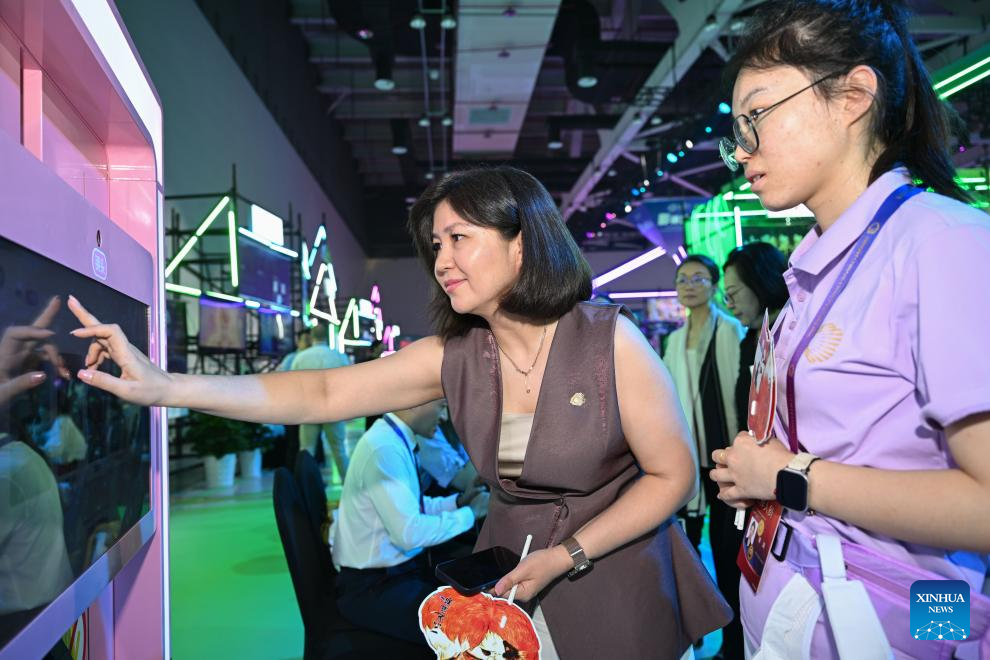 A guest interacts with an exhibit at the Yongchuan International Convention and Exhibition Center in southwest China's Chongqing, July 4, 2025. The 2025 SCO (the Shanghai Cooperation Organization) Film Festival takes place from July 3 to 7 here, attracting filmmakers from Russia, Belarus, Pakistan and other SCO member states to present their country's films. The event also gathered over 40 domestic film enterprises to present the latest advancements in film technology and production.