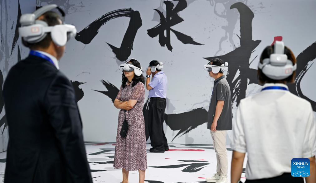 Guests enjoy VR films at the Yongchuan International Convention and Exhibition Center in southwest China's Chongqing, July 4, 2025. The 2025 SCO (the Shanghai Cooperation Organization) Film Festival takes place from July 3 to 7 here, attracting filmmakers from Russia, Belarus, Pakistan and other SCO member states to present their country's films. The event also gathered over 40 domestic film enterprises to present the latest advancements in film technology and production.