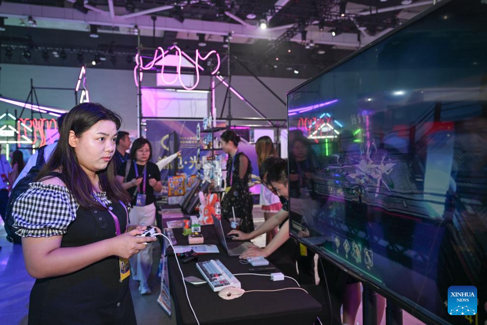 A guest tries a domestic game at the Yongchuan International Convention and Exhibition Center in southwest China's Chongqing, July 4, 2025. The 2025 SCO (the Shanghai Cooperation Organization) Film Festival takes place from July 3 to 7 here, attracting filmmakers from Russia, Belarus, Pakistan and other SCO member states to present their country's films. The event also gathered over 40 domestic film enterprises to present the latest advancements in film technology and production.