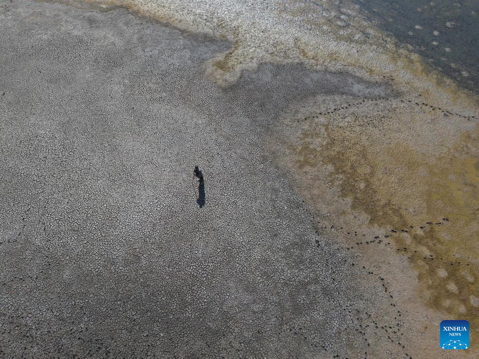 An aerial drone photo taken on July 2, 2025 shows the drought-stricken Kurtbogazi Dam in Ankara, Türkiye. As summer grips Türkiye's capital, Ankara, the city of nearly 6 million is confronting a worsening water crisis. Reservoirs are nearing historic lows, and drought conditions exacerbated by climate change threaten to deliver one of central Anatolia's weakest wheat harvests in years. (Mustafa Kaya/Handout via Xinhua) TO GO WITH Feature: Water crisis strains urban water, slashes crops in Turkish capital