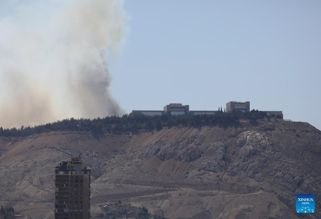 Smoke rises as a result of a fire that erupted near the Syrian al-Shaab presidential palace in Damascus, Syria, July 4, 2025. Unknown fire erupted Friday afternoon in bushes close to the Syrian al-Shaab presidential palace situated on top of a mountain overlooking the capital Damascus, sending thick plums of black smoke over wide areas, local media and witnesses said. (Photo by Ammar Safarjalani/Xinhua)
