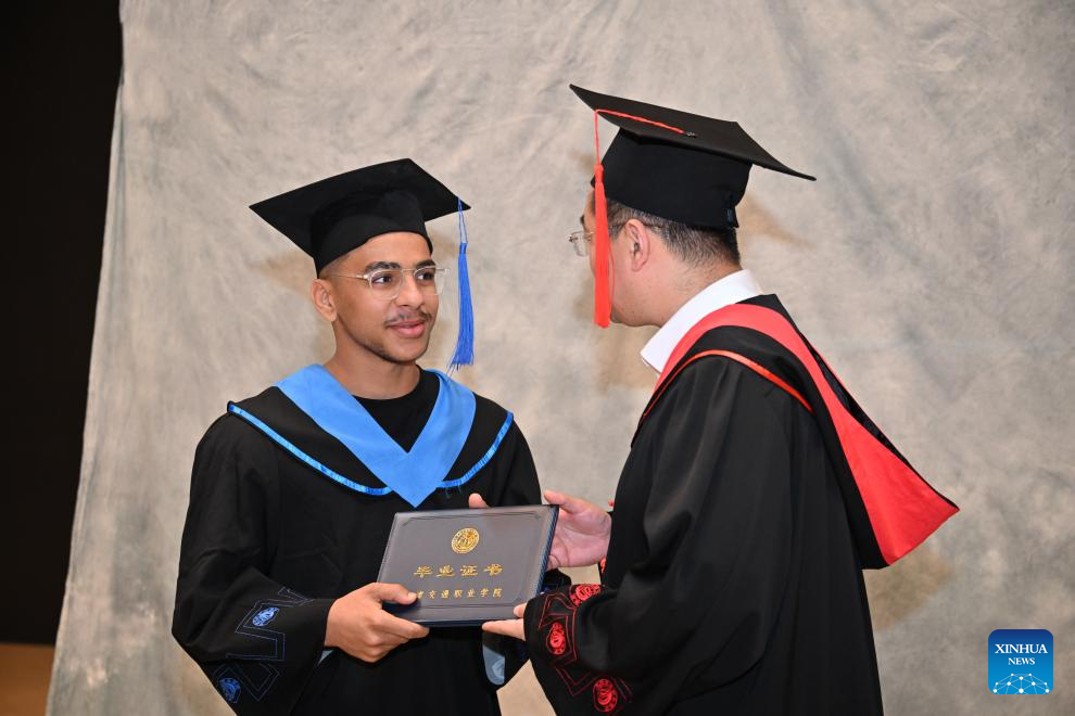 Mostafa Salah (L) attends a graduation ceremony at Tianjin Transportation Technical College in Tianjin, north China, June 29, 2025.(Xinhua/Sun Fanyue)