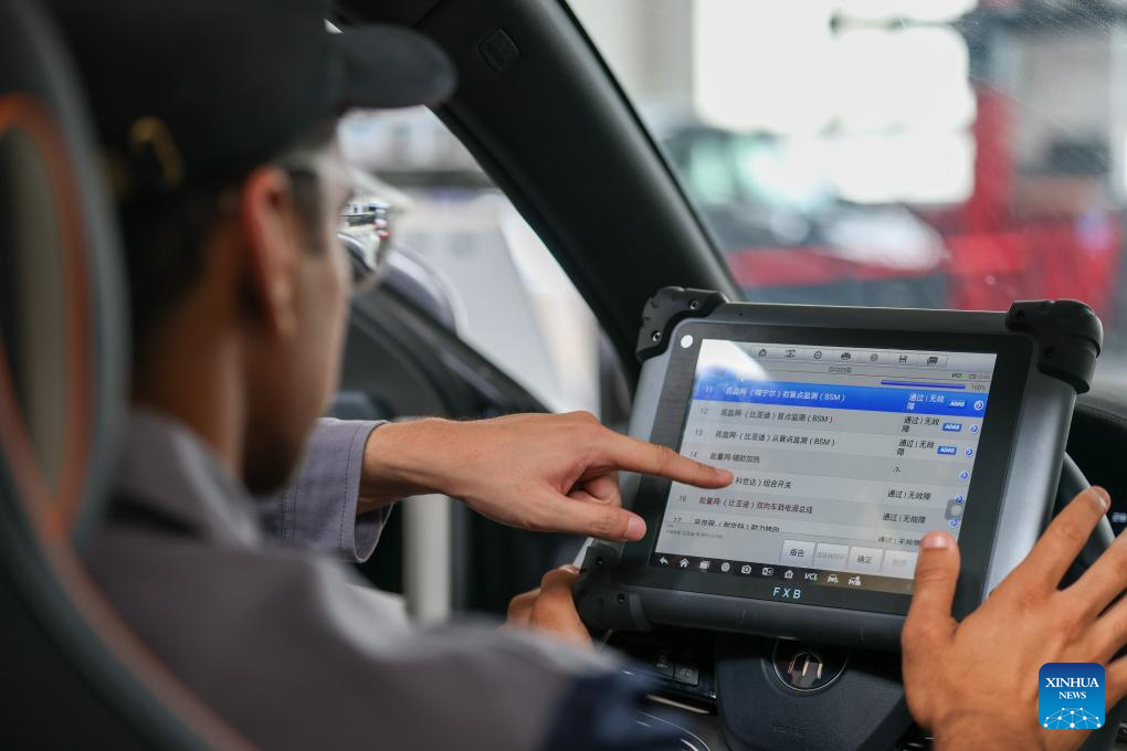 Mostafa Salah diagnoses faults in a new energy vehicle at a training center of Tianjin Transportation Technical College in Tianjin, north China, June 27, 2025. (Xinhua/Sun Fanyue)