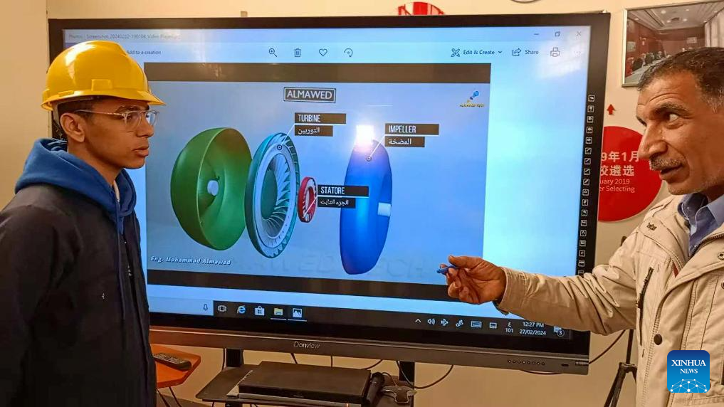 Mostafa Salah (L) studies in the Advanced Technical School for Maintenance Technology in Cairo, Egypt, Feb. 27, 2024. (Xinhua)