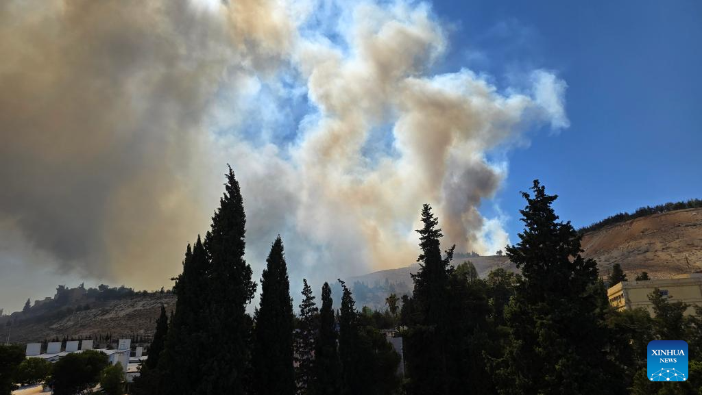 Smoke rises as a result of a fire that erupted near the Syrian al-Shaab presidential palace in Damascus, Syria, July 4, 2025. Unknown fire erupted Friday afternoon in bushes close to the Syrian al-Shaab presidential palace situated on top of a mountain overlooking the capital Damascus, sending thick plums of black smoke over wide areas, local media and witnesses said. (Photo by Hummam Sheikh Ali/Xinhua)