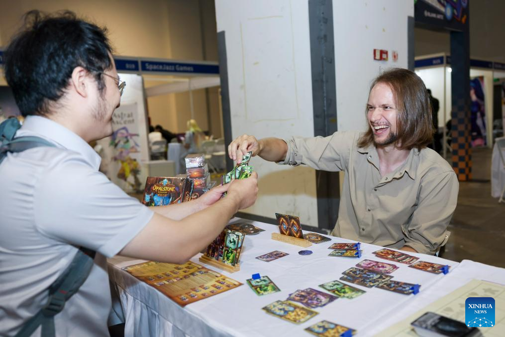An exhibitor from Russia demonstrates a self-designed card game during the China International Cartoon & Game Expo 2025 (CCG Expo 2025) in east China's Shanghai, July 4, 2025. The CCG Expo 2025 kicked off Friday at the Shanghai Convention and Exhibition Center of International Sourcing with the participation of 480 domestic and international exhibitors. The event will last until July 6. (Xinhua/Wang Xiang)