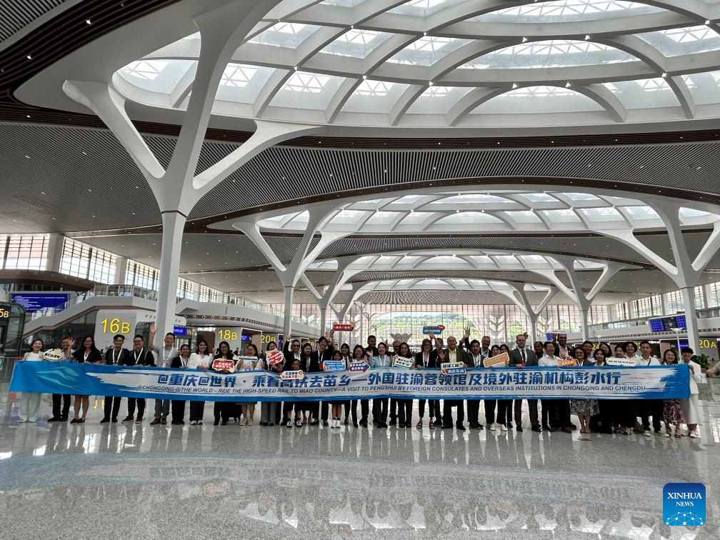 The delegation first visited the newly opened Chongqing East Railway Station on Wednesday morning, where they took a high-speed train to Pengshui Miao and Tujia Autonomous County for a two-day visit to deeply savor Miao ethnic culture and explore cooperation opportunities. (Xinhua/Wu Mengtong)