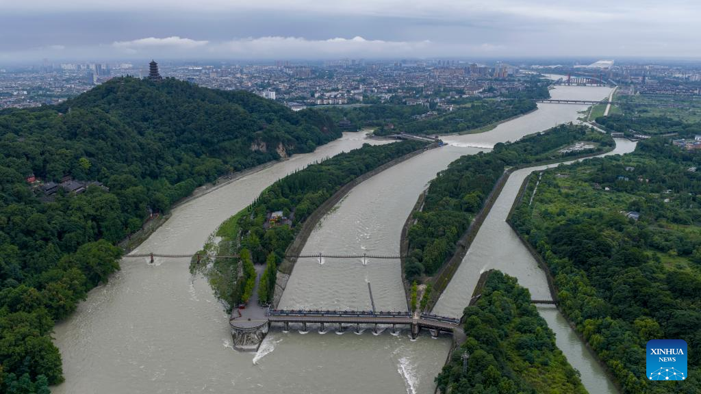 An aerial drone photo taken on July 4, 2025 shows a view of Dujiangyan irrigation system in southwest China's Sichuan Province. Dujiangyan irrigation system on the Minjiang River saw a flood peak on Friday. (Photo by He Bo/Xinhua)