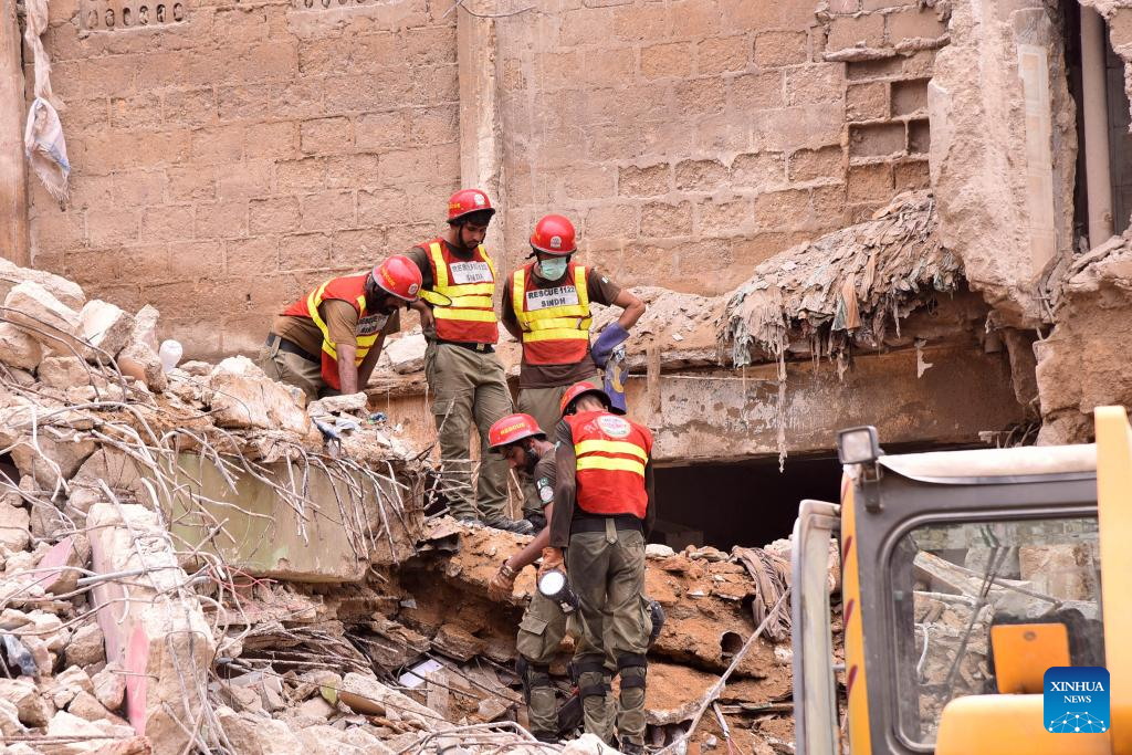 ISLAMABAD, July 5 (Xinhua) -- The death toll from the collapse of a residential building in Pakistan's southern port city of Karachi rose to 17 as more bodies were recovered from the debris, a spokesperson of the state-owned rescue organization Rescue 1122 told Xinhua on Saturday morning.