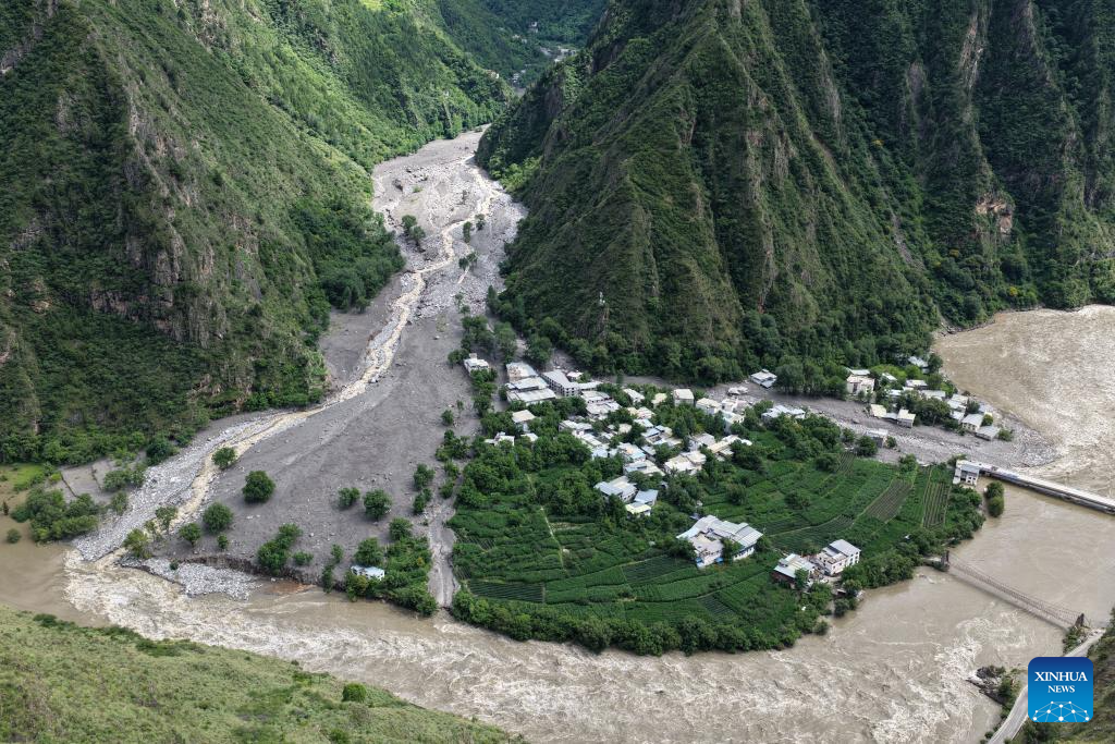 An aerial drone photo taken on July 5, 2025 shows a site of mudslide in Rongchag County, Garze Tibetan Autonomous Prefecture, southwest China's Sichuan Province. (Xinhua)