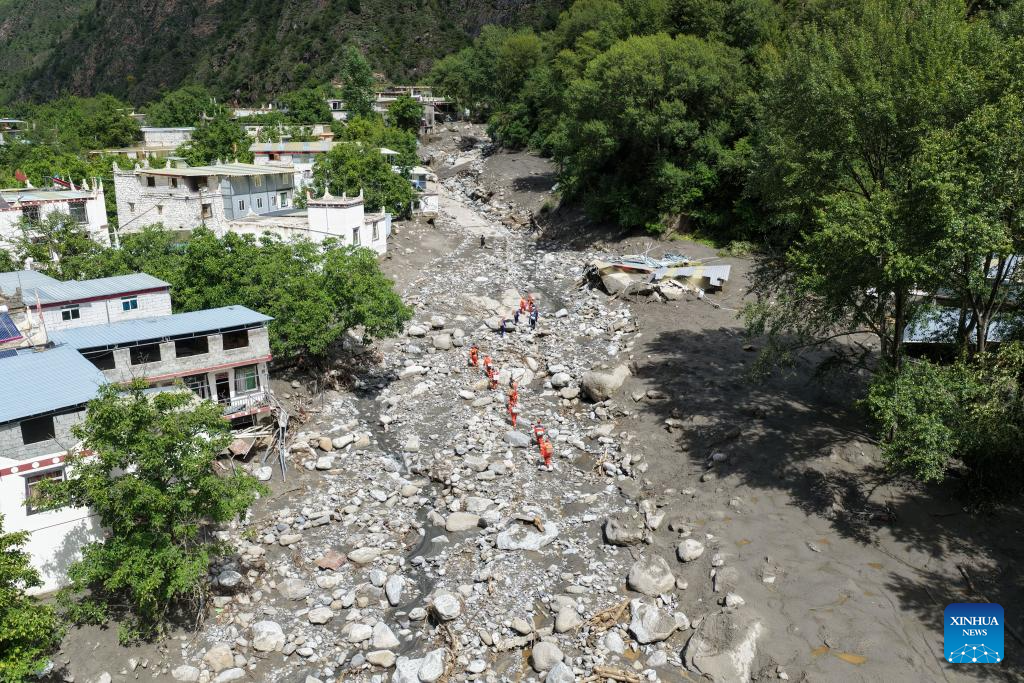 Rescuers search for survivors at a site of mudslide in Rongchag County, Garze Tibetan Autonomous Prefecture, southwest China's Sichuan Province, July 5, 2025. (Xinhua)