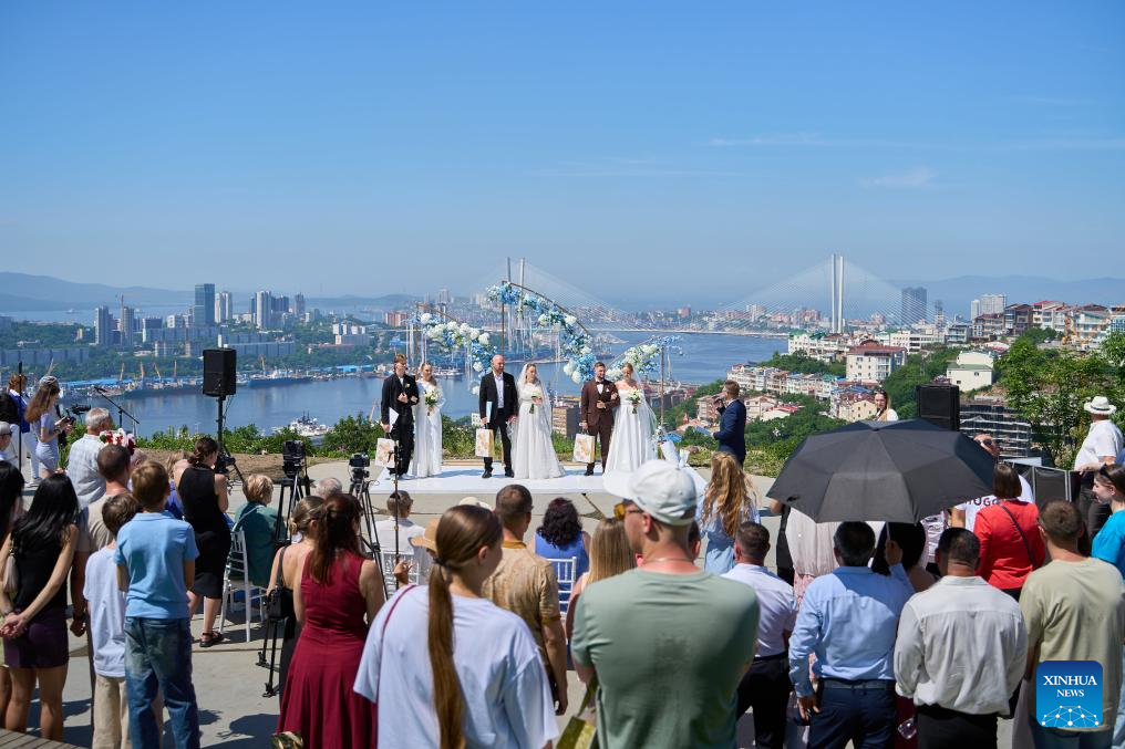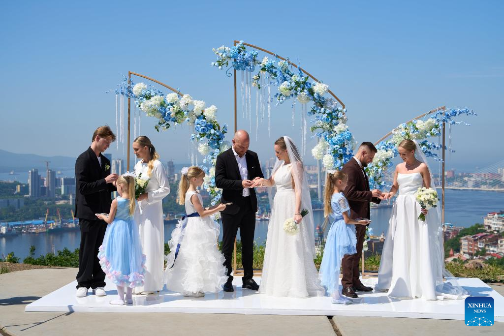 Three couples join in a group wedding ceremony at Highland Park in Vladivostok, Russia, July 5, 2025. Three newlywed couples join in a group wedding ceremony here on Thursday, receiving blessings from families and friends. (Photo by Guo Feizhou/Xinhua)