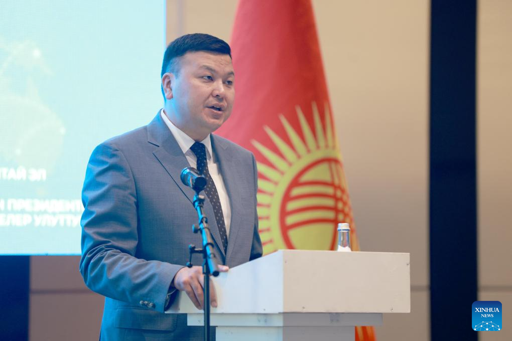 Kyrgyz Minister of Justice Ayaz Baetov, also director of the National Institute of Strategic Initiatives under the President of the Kyrgyz Republic, speaks at an academic conference titled "Shanghai Spirit: Bridges of Mutually Beneficial Cooperation and Sustainable Development within the SCO," in Bishkek, Kyrgyzstan, July 4, 2025. The conference was held here on Friday, bringing together over 100 participants from the political, academic, business and other sectors of China and Kyrgyzstan. (Photo by Roman/Xinhua)