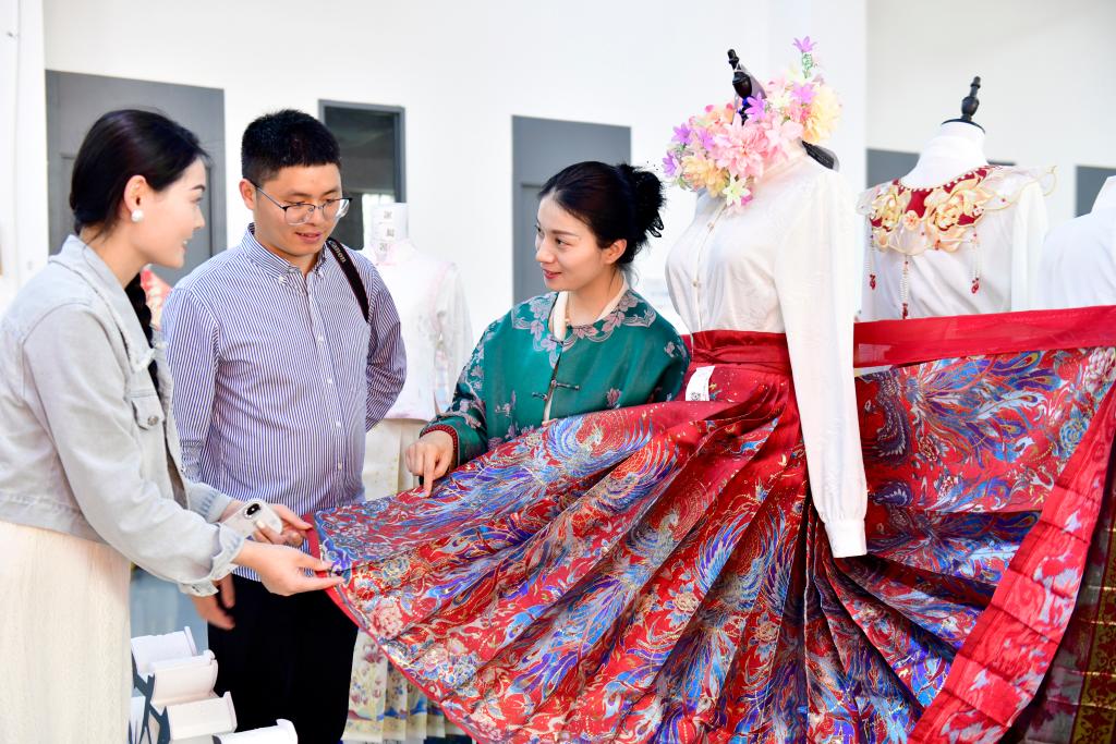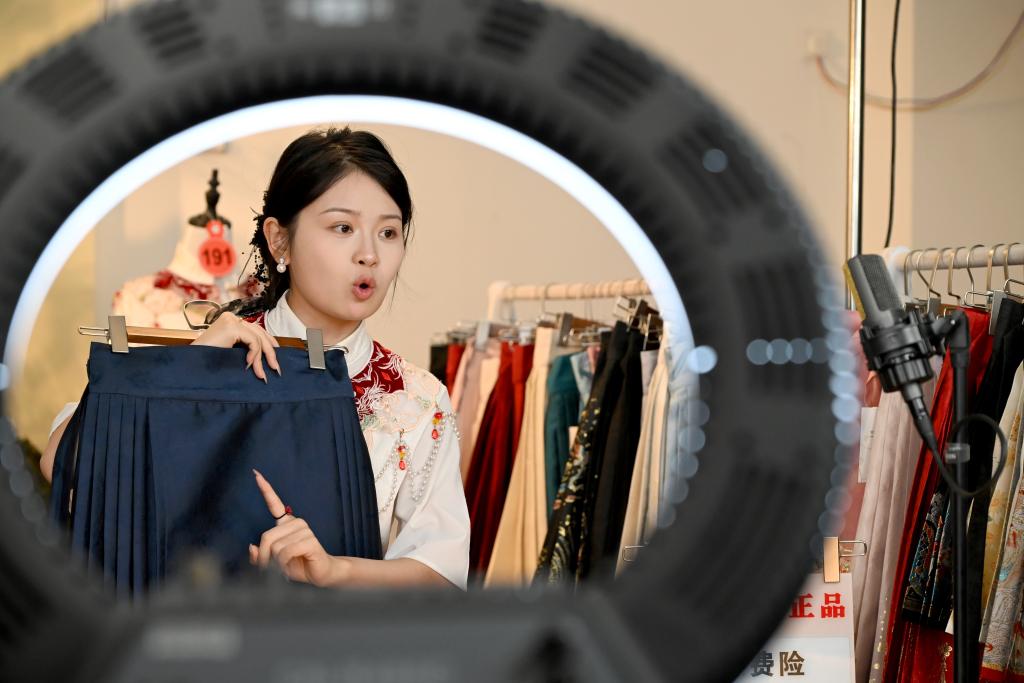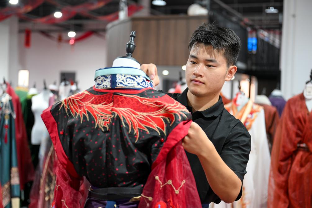 A participant of a training course hosted by China Woman's University views Hanfu at a digital economy industrial park in Caoxian County, east China's Shandong Province, June 19, 2025. (Xinhua/Guo Xulei)A participant of a training course hosted by China Woman's University tries on Hanfu attire at a Hanfu base in Caoxian County, east China's Shandong Province, June 19, 2025. (Xinhua/Guo Xulei)A staff member works at a Hanfu design studio in Caoxian County, east China's Shandong Province, June 18, 2025. (Xinhua/Shao Zedong)A staff member monitors the work of embroidery machines in an embroidery enterprise in Caoxian County, east China's Shandong Province, June 19, 2025. (Xinhua/Xu Jiayi)A staff member arranges Hanfu at a Hanfu base in Caoxian County, east China's Shandong Province, June 18, 2025. (Xinhua/Xu Jiayi)An embroidery machine is seen at work in an embroidery enterprise in Caoxian County, east China's Shandong Province, June 19, 2025. (Xinhua/Shao Zedong)A staff member promotes Hanfu via livestreaming at a Hanfu base in Caoxian County, east China's Shandong Province, June 17, 2025. (Xinhua/Sui Shangjun)Models present Hanfu on the stage during a Hanfu launch event held at a digital economy industrial park in Caoxian County, east China's Shandong Province, April 10, 2025. (Xinhua/Guo Xulei)